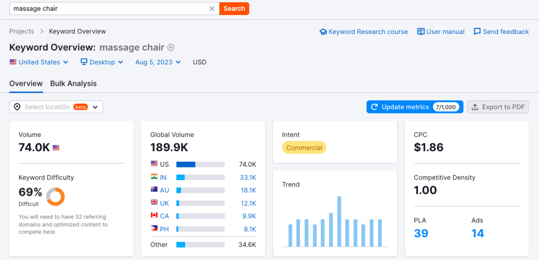 还是以上面的高端按摩椅为例子,可以看看其关键词概况。会发现其实搜索量其实并不低,且相关关键词众多,新站点完全可以在这个领域分一杯羹。