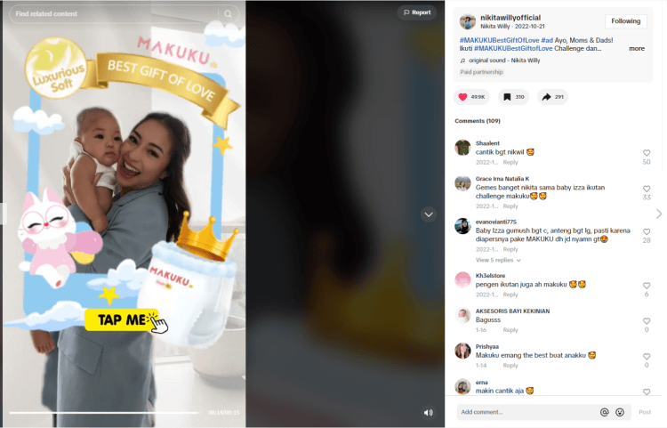 此外,MAKUKU还邀请到了三位印尼顶流明星、以及众多母婴垂直领域的KOL参与活动,这些明星和头部创作者以全民挑战赛选取的Best和Love两个关键词为出发点,从产品价值和情绪价值的双重角度,调动了TikTok平台更广大UGC的参与热情和分享欲。