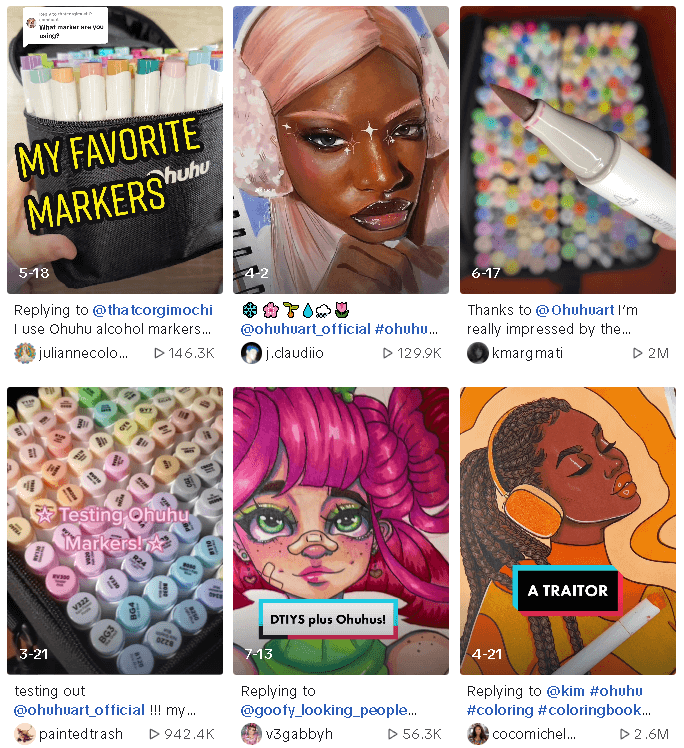 Ohuhu 鼓励所有喜爱 Ohuhu 产品的 TikTok 用户分享使用 Ohuhu 产品的视频,并参与到参与特定的标签挑战里。可以看到,在 TikTok 上,与 Ohuhu 相关的视频播放量基本都有着不俗的播放量。