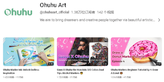 在 YouTube 平台上,Ohuhu 主要分享高质量的绘画作品、创作过程视频,提供绘画技巧、创作教程等,让用户更多地了解 Ohuhu 的产品和创意,增加品牌在市场上的好感度与知名度。从 2018 年发布至今,Ohuhu 在 YouTube 上的官方账号已经积累 1.38 万的粉丝量,平均观看量达到上万次。
