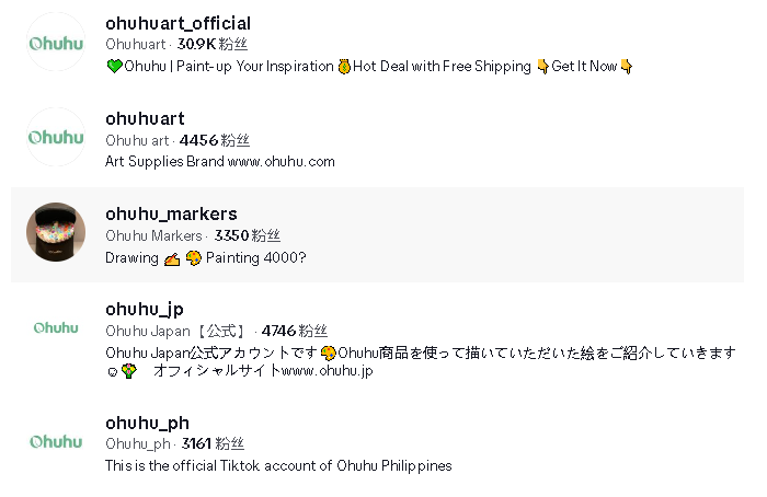 Ohuhu 在 Tik Tok 上采取的是账号矩阵的模式,目前在日本和菲律宾站点也都有各自对应的 TikTok 账号,各个账号之间相互引流,快速提升品牌在 TikTok 上的知名度。
