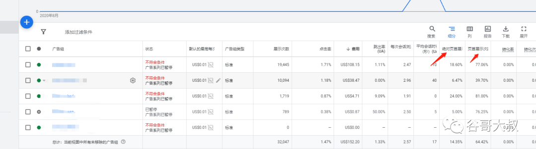 看我们的页首展示份额。如果你出价太低,那么你的页首展示份额以及绝对页首展示份额可能也会相对较低,你的广告大部分时间可能展示在搜索结果下方,那么意味着目标客户已经看过很多网站了,才看到你。