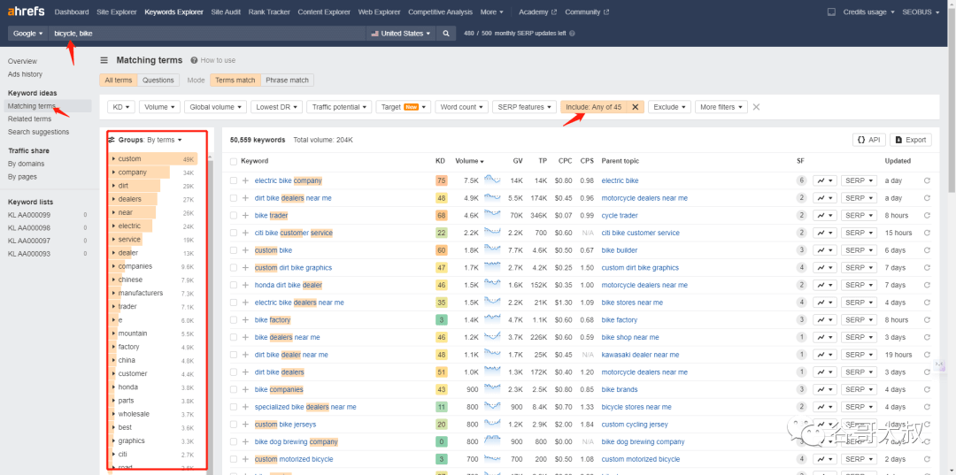 除此之外,我们还需要注意的一点就是图中红框中的by terms里面的词汇,这些词跟是由我们筛选的这些带B端属性词的词根,因此我们可以提前找出和我们业务不相关的词根,提前否掉,从而减少无效花费。