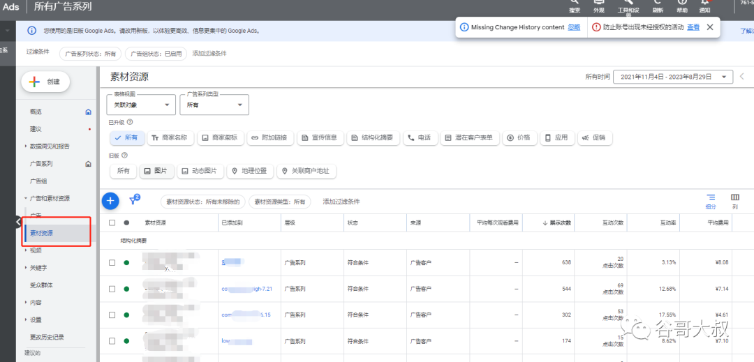 看自己的素材资源组里面的信息是否完善,这里能填写的信息尽量填写一下, 有利于向目标客户展示更丰富的内容,从而提高广告的点击率。