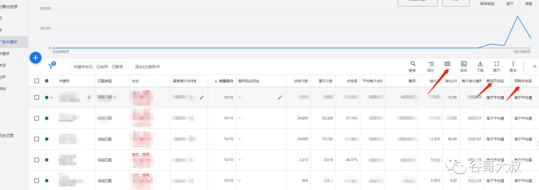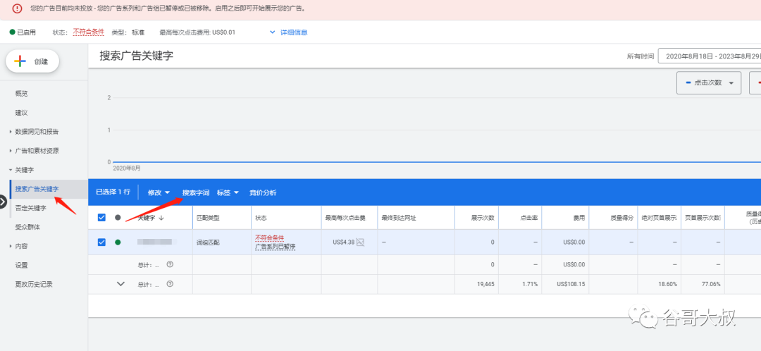 找到我们花钱最多的搜索广告系列,在广告系列中同样以花费高低为优先级,优先分析花费高的广告组,关键词。然后再依次查看其它广告组,关键词。然后从花费高低依次去查看我们关键词投放的是否准确,如果关键词准确,那么我们广告基本成功了一大半。