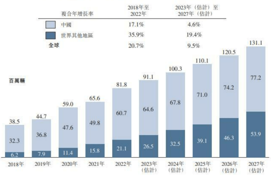 2018 年至 2027 年全球两轮电动车的市场规模(含预测) | 图片来源:印度电动车制造商协会、美国国家自行车经销商协会、欧洲自行车产业协会、欧洲摩托车生产商协会、弗若斯特沙利文