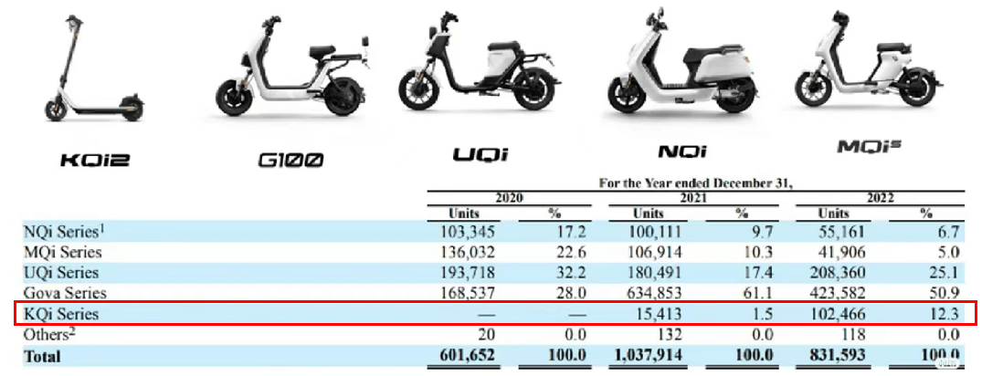 笔者在看小牛 2023-Q2 财报和销售数据的时候看到了一个很有意思的现象:海外市场销量为 3.3 万辆,与去年同期相比增长 17.1%;海外营收 1.14 亿元,较去年同期下滑 21.6%。海外市场销量在涨,而收入却大幅下滑,这直接导致国际市场每辆车收入同比下降 33%。这个反差主要是由于国际市场中销售的便宜车型——电动滑板车 KQi 系列的比例增加。虽然 KQi 以一己之力直接拉低了海外车均收入,但其销量的增长确实非常抢眼。
