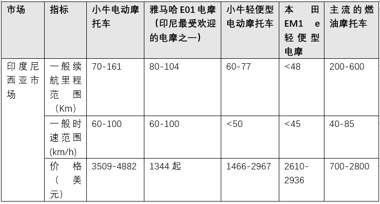 印尼市场小牛电摩与本地品牌电摩、燃油摩托车性能与价格对比 | 白鲸出海根据全网资料整理,资料来源不包含线下渠道,如有差异属正常现象,仅供参考