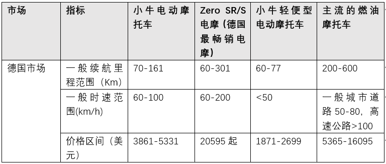 德国市场小牛各类型电摩与当地畅销款电摩 Zero SR/S 以及主流的燃油摩托车的 参数对比 | 白鲸出海根据全网资料整理,资料来源不包含线下渠道,如有差异属正常现象, 仅供参考