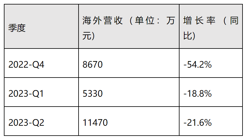 具体来说是从 2022 年 4 季度起,小牛的海外营收开始急转而下。根据财报,2022 年第四季度小牛海外营收同比大跌 54.2%,增长率转正为负。然而这并不是一次突发事件,结合小牛今年的财报数据来看,1 季度海外营收同比下降 18.8%,2 季度同比下降 21.6%,营收下滑的情况还在持续。