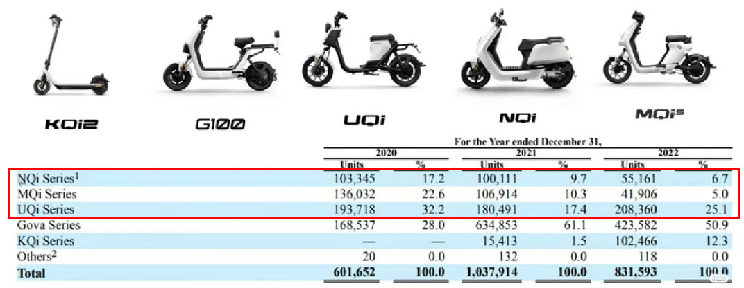 海外收入整体在下降,而海外收入主要是由电动摩托车和电动滑板车的销售额构成的(E-bike 只有一个车型,被算在了下图的 Others 里面)。智通财经分析师称,“均价较低的 E-scooter 电动滑板车(下表中的 KQi2)抬升了整体销量”,但因为单价更低,并不能阻止海外整体收入下滑的趋势。结合 2020 年-2022 年,小牛全球收入(国内+海外)中不同系列的占比变化来看,海外收入下滑与电摩销量下降直接相关。