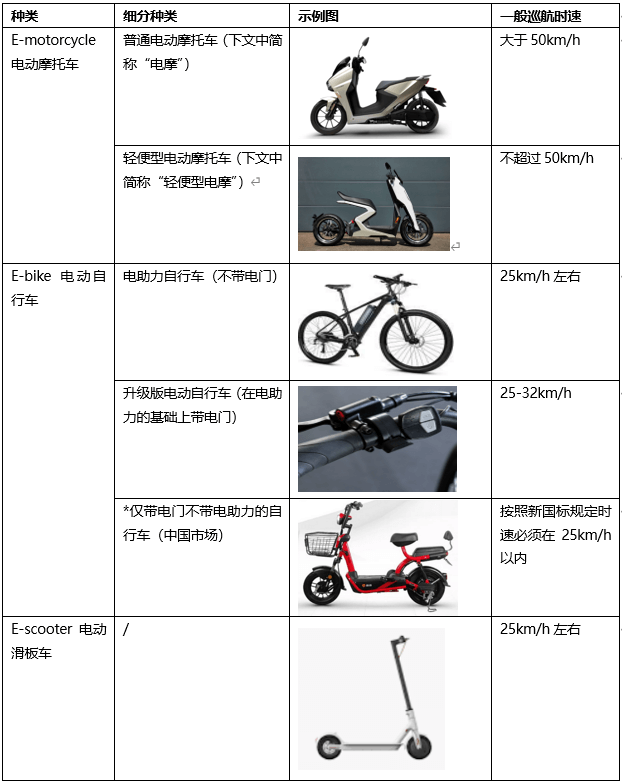国外市场不像国内市场需要受“新国标”和“禁摩令”的管控。由于能够合法行驶的车型非常有限,国内市场上主要流行时速 25km/h 以内的两轮电动车产品,而国外市场具有其自身的特殊性和复杂性。在不同国家和地区,两轮电动车主要包含 3 个细分品类:E-motorcycle 电动摩托车、E-bike 电动自行车以及 E-scooter 电动滑板车,各个品类都有其存在和发展空间。