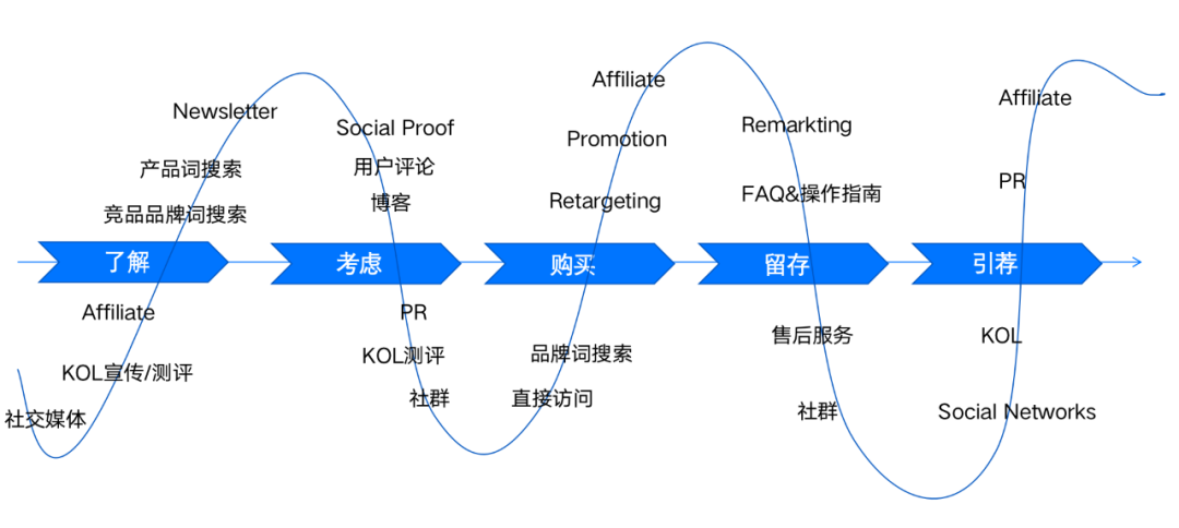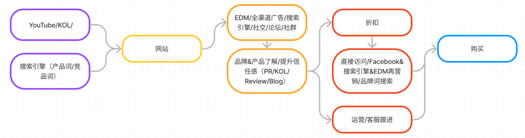 -产品专业度高、客单价高的产品,转化购物的用户旅程较长,这种比较适合走品牌力渠道路线,往往也需要充足的预算来进行投入。我们需要根据用户在转化过程中所处的不同阶段来规划不同的推广方式,从而实现每个阶段的推广目标。