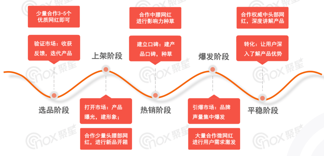 根据Nox聚星的执行经验,对于大多数产品来说,在前期少量合作3-5名优质网红以验证市场收获反馈,中期头部、腰部、尾部网红配合合作,依靠头腰部网红打响曝光,收割公域流量,尾部网红促进转化收割私域流量,从而使得产品成功打入目标市场。