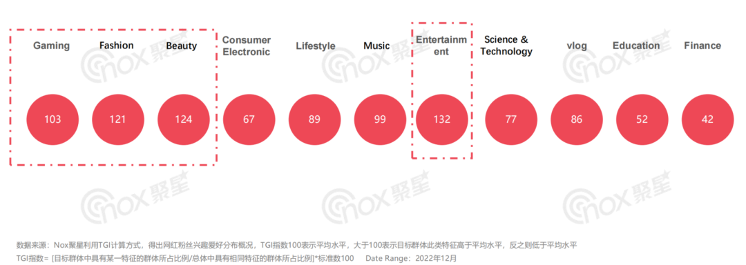 根据Nox聚星TGI计算方式得出TikTok网红粉丝兴趣爱好分布情况。可以看出在各平台用户属性愈发明显的2022年,TikTok短视频娱乐属性突出,用户更加偏向娱乐属性内容。