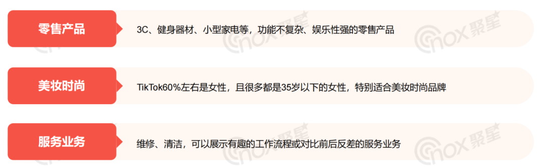 结合这三个特点,再加上Nox聚星实际执行经验来说,零售、美妆、服务业务产品会更适合TikTok网红营销。