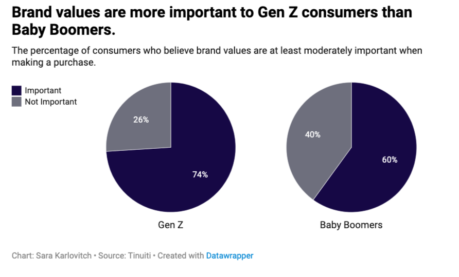 74%的Z世代消费品消费者表示,他们购买的品牌的价值观和信念对他们有一定的重要性,这一比例高于任何其他一代。