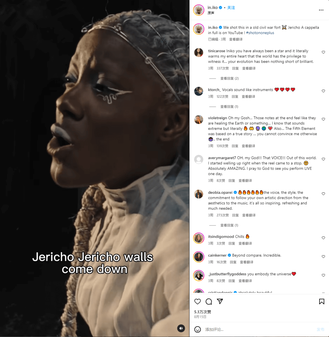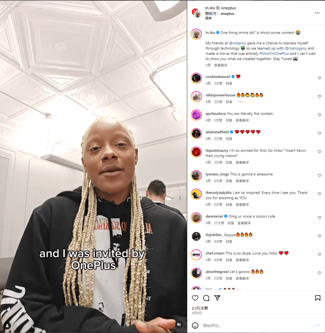 8月9日,INKIO发了一条Reels,并使用了联合发帖功能和一加的官方账号一起向双方粉丝宣告了一个消息,INKIO将会使用一加的手机完成一条MV的拍摄,并让大家期待起来。