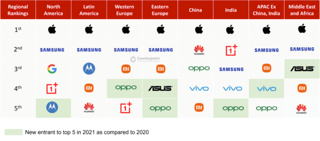 根据市场调研机构Conterpoint公布的一份数据报告显示,2020年第一季度全球高端智能手机(售价400美元以上)领域中,一加在北美、欧洲、中东和非洲等多个地区进入前五。排在一加前面的,是苹果、华为、三星这些巨头。