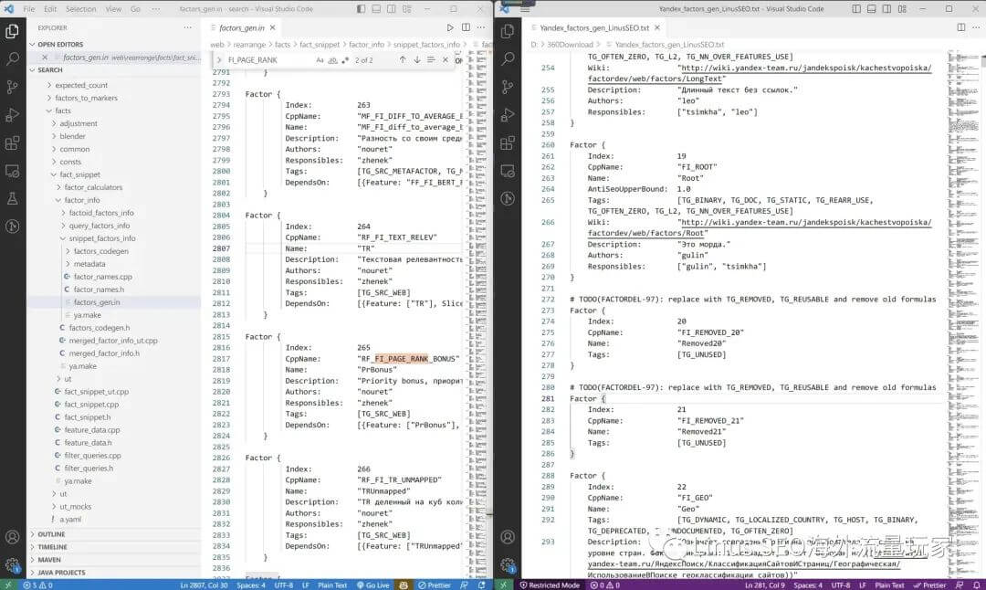但这不是巧了吗?作为网络安全&程序员出身的Linus刚好能够看得懂,在翼果科技的SEO算法研究组里面也有足够的资源去分析,所以我们下载了所有的代码去看。然而通篇都是C++和Python混合编写的代码让人看得脑壳痛。这个事件已经过去近半年,忙里抽空里好一顿分析,过几天(或者几周……)发一下我的分析情况,Yandex有1800+个的排名因素,可以持续关注哦。(下图为分析的排名因素代码)