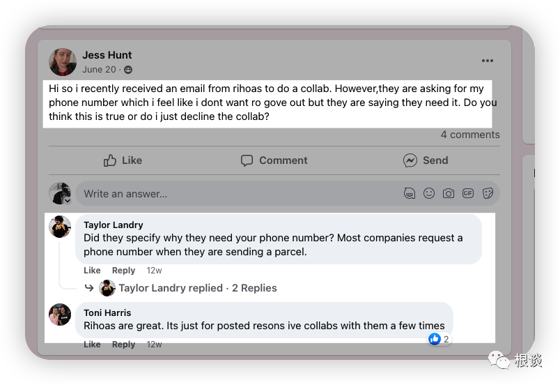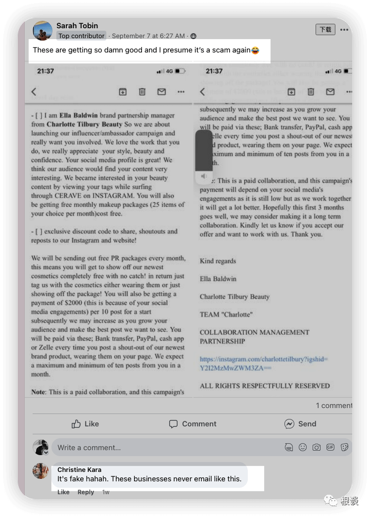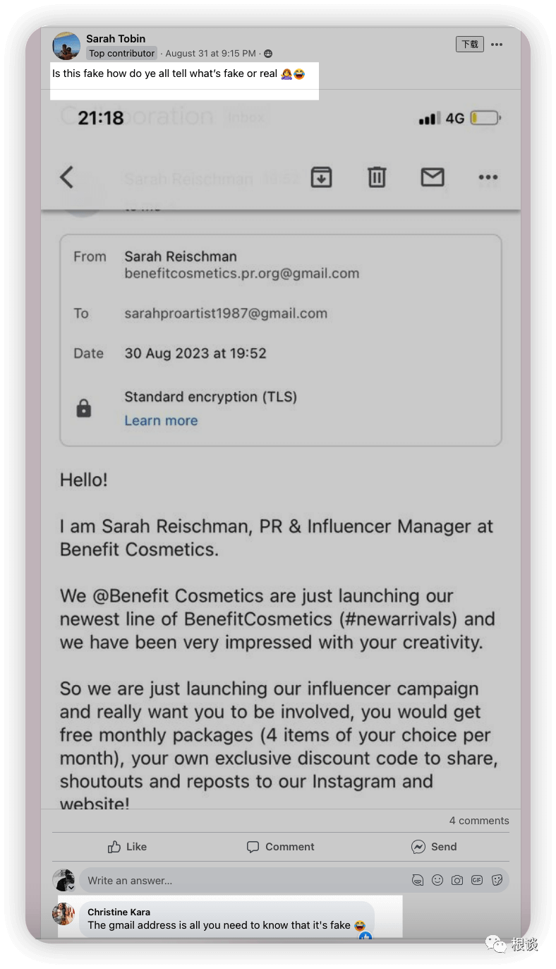 Is this a scam 或者 if this is legit 并附上邮件截图是网红在社群里面讨论得最多的话题,其他网红也会评论提供帮助参考,总结网红的评判标准: