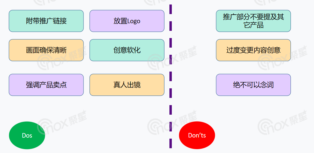 将Do’s 和Don’ts列出来一定要非常仔细和细致,具体到网红需要以视频为中心还是以配图为重点,哪些关键词必须要提到等等。根据Nox聚星实际经验来看,这些关键词越清晰,网红触达效果越好。