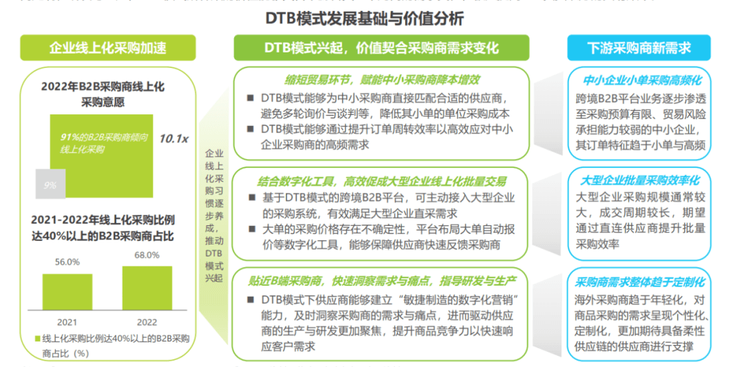 9月12日,艾瑞咨询发布的《2023年中国跨境出口B2B电商行业发展洞察》(下称《报告》)指出,2022年超九成采购商会选择通过线上化来满足自身采购需求,同时,2022年线上化采购的B2B采购商占比达到68%,相比2021年增长12%,B2B采购商线上化采购习惯逐步养成,推动B2B线上化进程持续深化,不断缩短交易链路,推动DTB模式兴起。