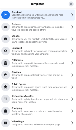 如果您在 2023 年仍然可以访问经典的 Facebook 页面界面,您将能够从 Facebook 页面模板菜单中选择 10 种不同的模板之一。