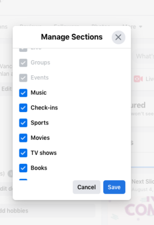 您还可以通过单击菜单栏中的更多并选择管理部分来调整部分。只需切换您想要显示或隐藏的部分即可。