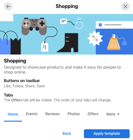 购物 Facebook 页面模板对于任何销售实体产品的企业都很方便,无论他们拥有电子商务商店还是实体商店。