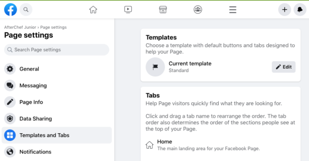 要自定义您的 Facebook 页面模板,请转到页面设置并点击模板和选项卡。