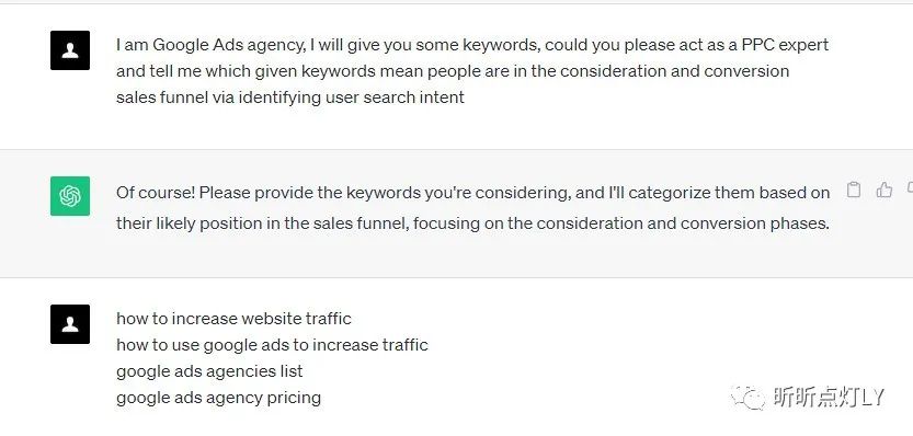 然后我告诉ChatGPT,我是谷歌广告代理商,希望它可以像PPC专家一样去分析我给出来的关键字的搜索意图和处于转化漏斗哪个阶段。