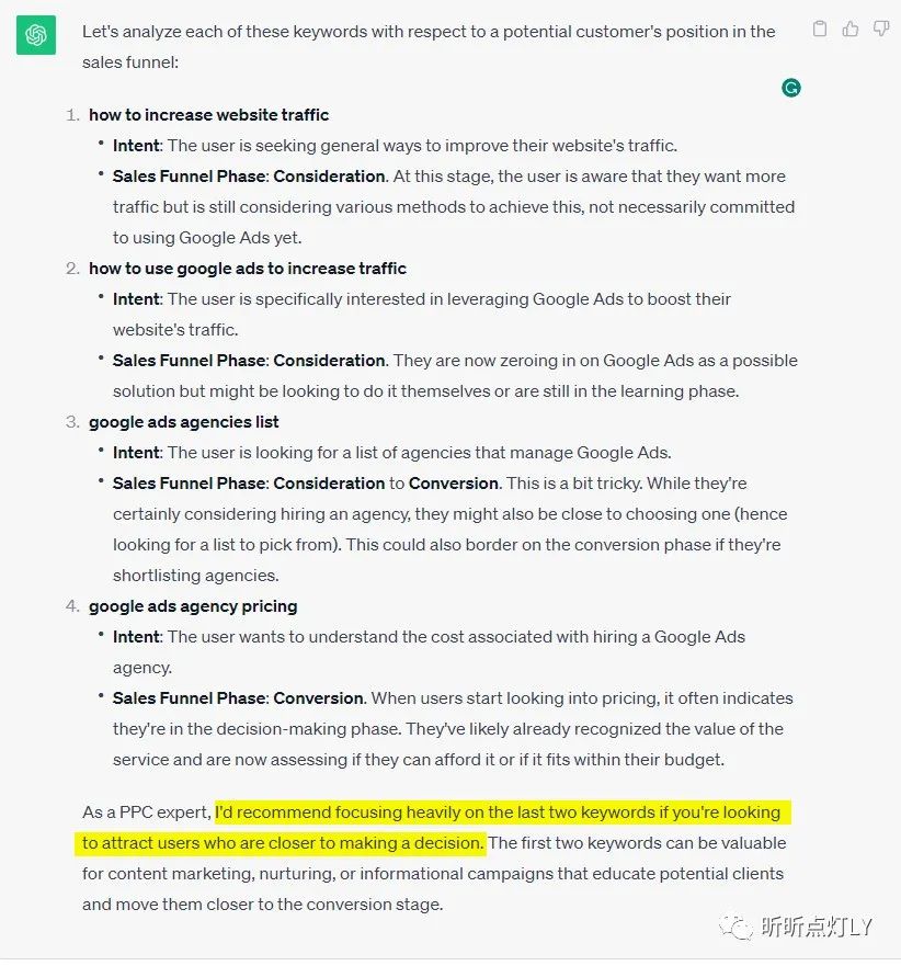 ChatGPT对每个关键字都做了详细的意图和转化漏斗阶段分析。而且在最后,它还特别提醒如果想吸引那些即将做出决定的用户,把重点放在最后两个关键词上 – google ads agencies list和google ads agency pricing。对于想要在短期内看到广告带来高回报,这是一个非常实用的建议。
