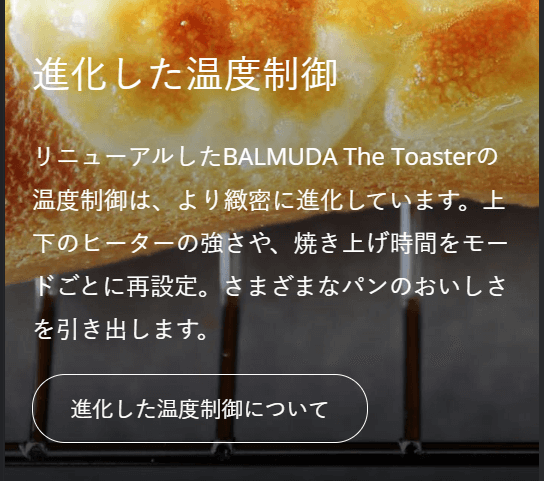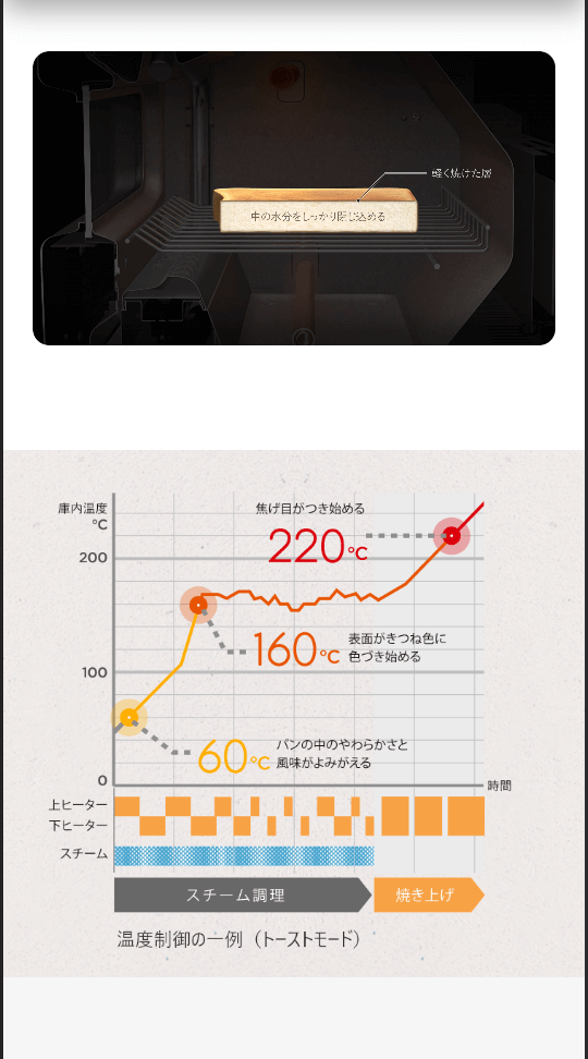 ✅ 将烤出美味面包的要点拆解为3个(根据最常见的吐司面包吃法定制化了5种自动模式、特有的高温与蒸汽技术实现不同吐司位置不同的烤制程度、全新升级进化的精细化自动控温技术)
