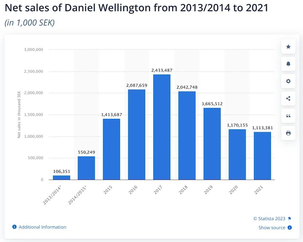 据了解,Daniel Wellington还给KOL做定制化的限时优惠和闪购活动。这一策略不仅增加了他们在社交媒体上的影响力,还直接促成了销售额的激增。2019年,他们的收入超过2亿美元,其中很大一部分归功于KOL营销活动。