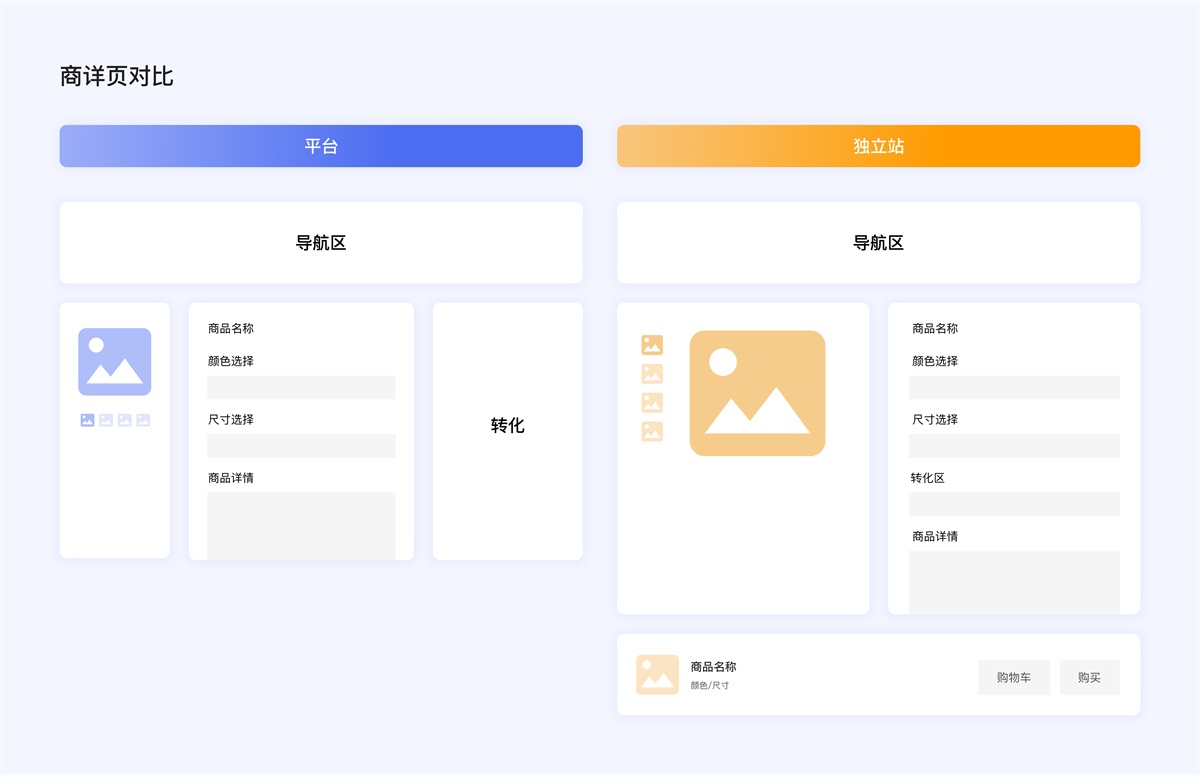 独立站和平台商详页最大区别在于首屏的信息结构,独立站分为两块:图片+信息,给图片本身留出了较大展示区,而信息聚焦于最核心的款式和价格,转化区域吸底目的为了强化转化率+占用过少空间。然后平台首屏分为三块,将转化区置于页面的右方来强化用户首屏下的转化率,缺点在于用户下滑到页面下方时无法进行转化操作。有的平台会将右边转化区悬浮,缺点在于会压缩下方的商品详细信息区。