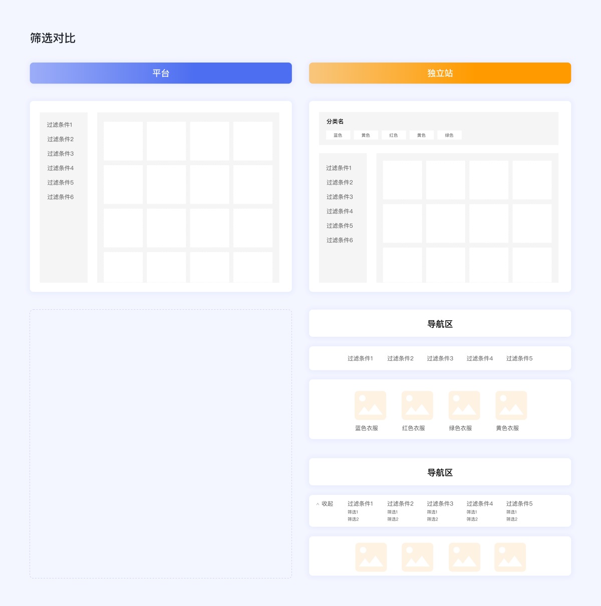 平台筛选区普遍使用左右结构的设计,左边的筛选区加上右边的商品列表,筛选区默认主动展开常用而收起低频筛选项。筛选项较多情形下操作效率较高,但占据空间大同时影响整体视觉效果。