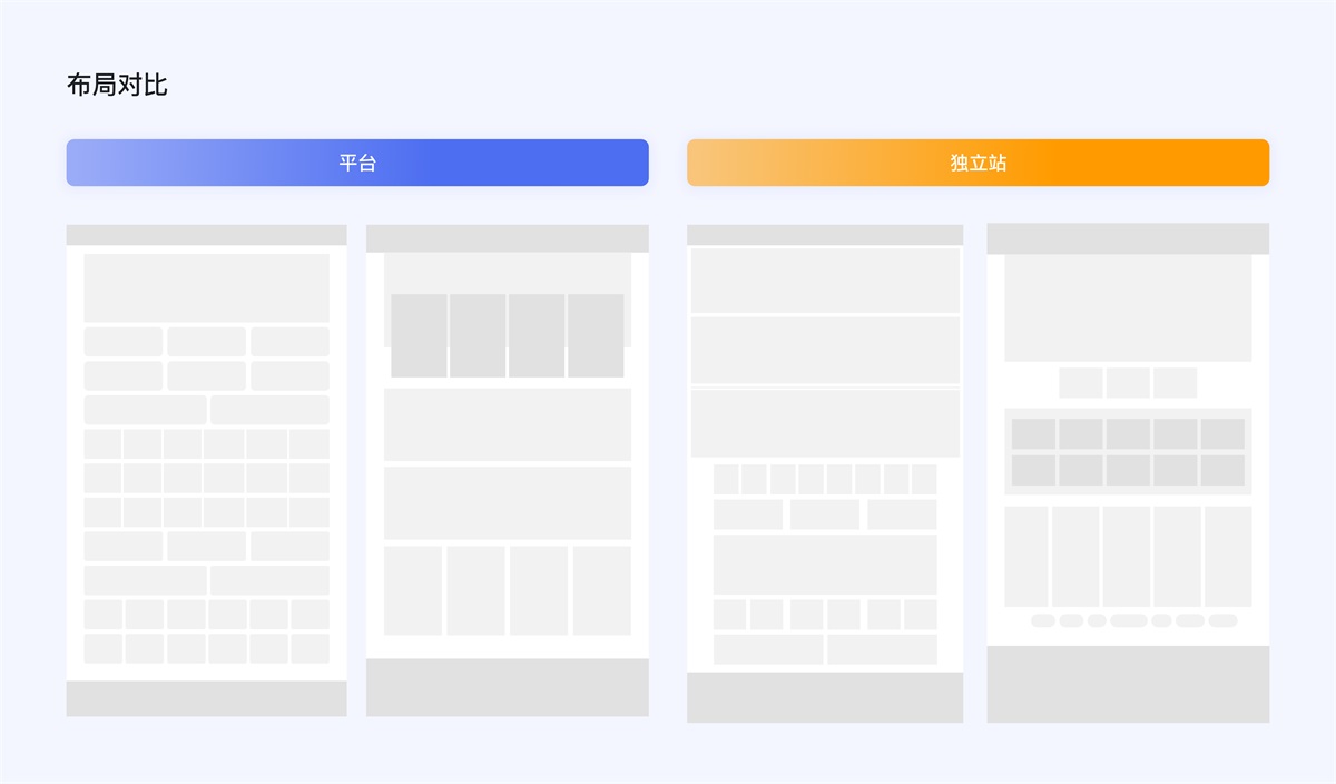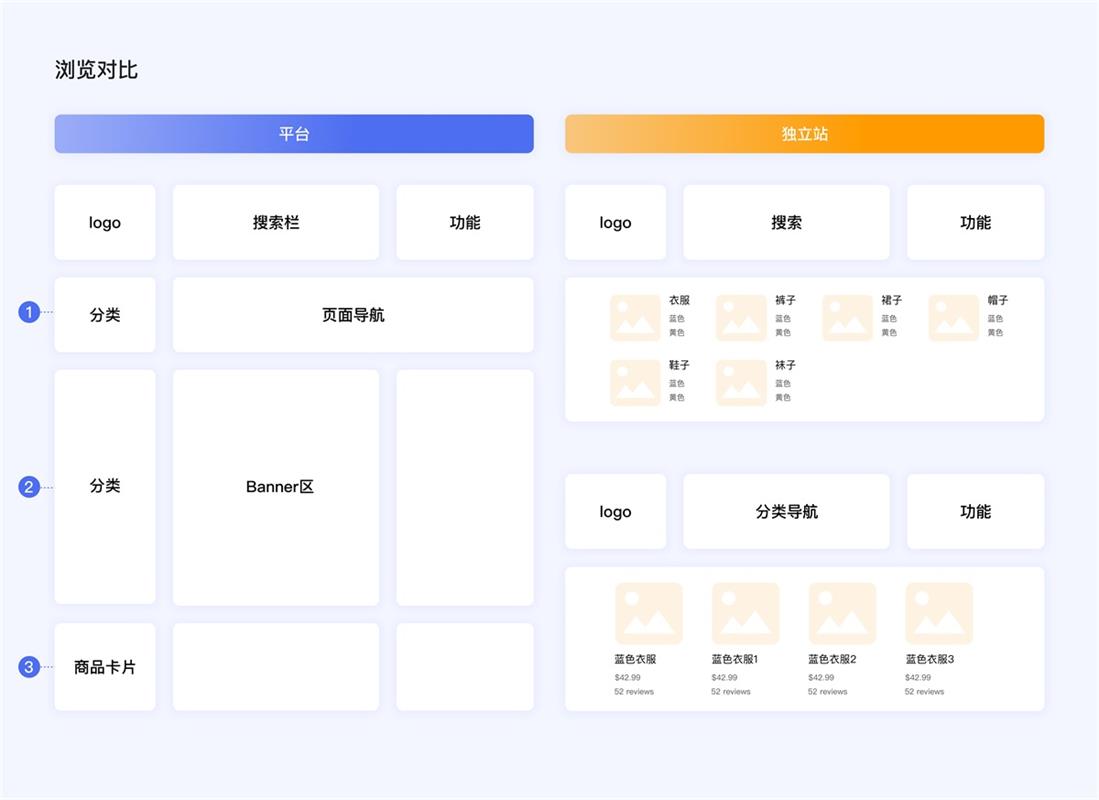 我们认为独立站和平台本质的差异在于独立站将商品内容化。平台就像货架上摆满各类型商品,需要用户快速找到并进行交易。而独立站把商品内容化,慢慢建立形象并输出内容从而和用户建立情感联系。那下文接着就将从导航、交易流程、视觉三个方面来分析两者基于货架和内容体验上的差异性。