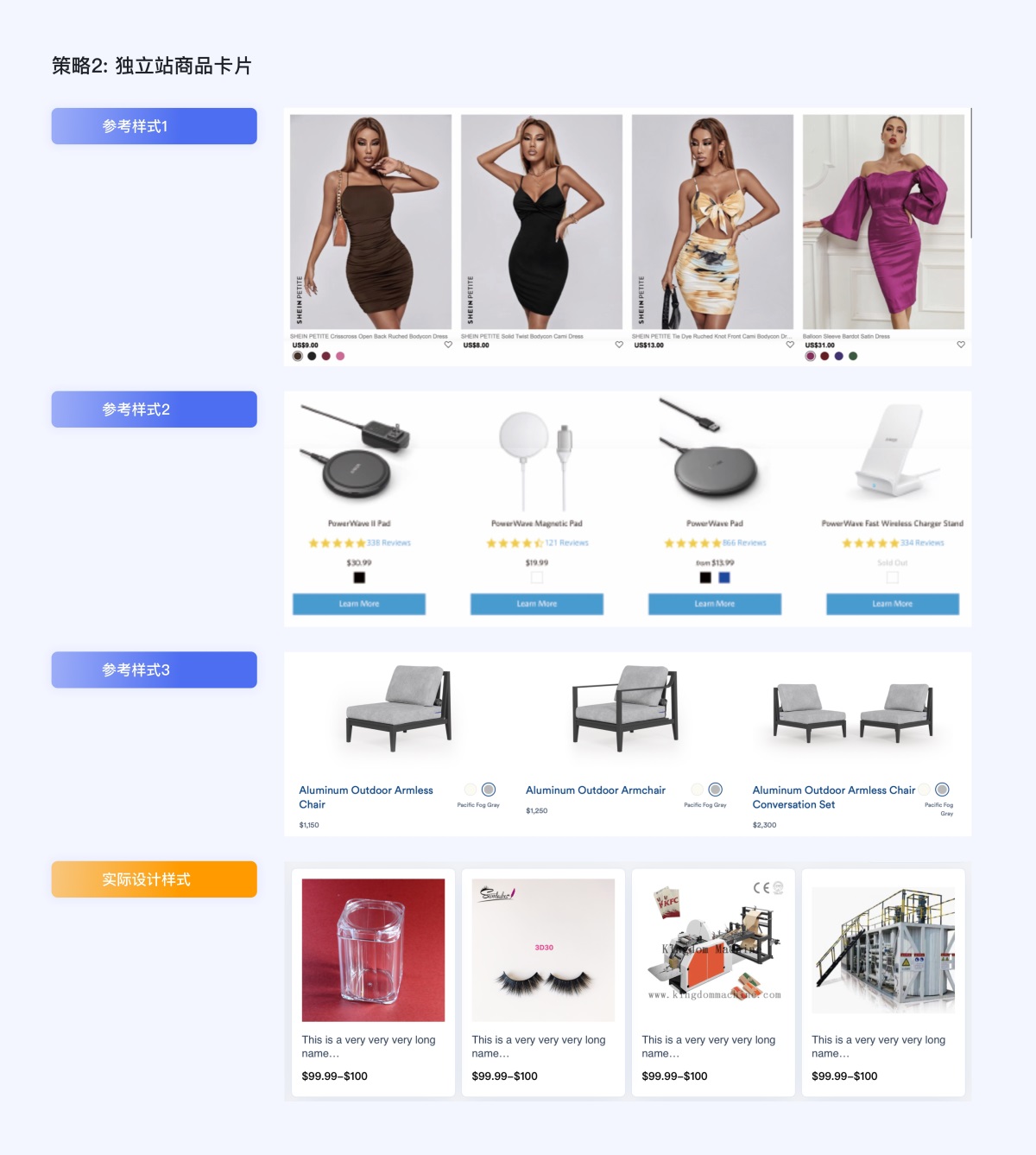样式 1 这样通过固定底色的模式对于图片本身要求过高。而像样式 2 和 3 只通过间距区分会带来问题,实际下的商品图片有的有底,有的没底,容易产生不一致的场景。因此最后实际设计样式直接给了整体背景底色,然后用白色的卡片来区分商品,同时缩小了图片所占的面积来避免图片质量差的影响。