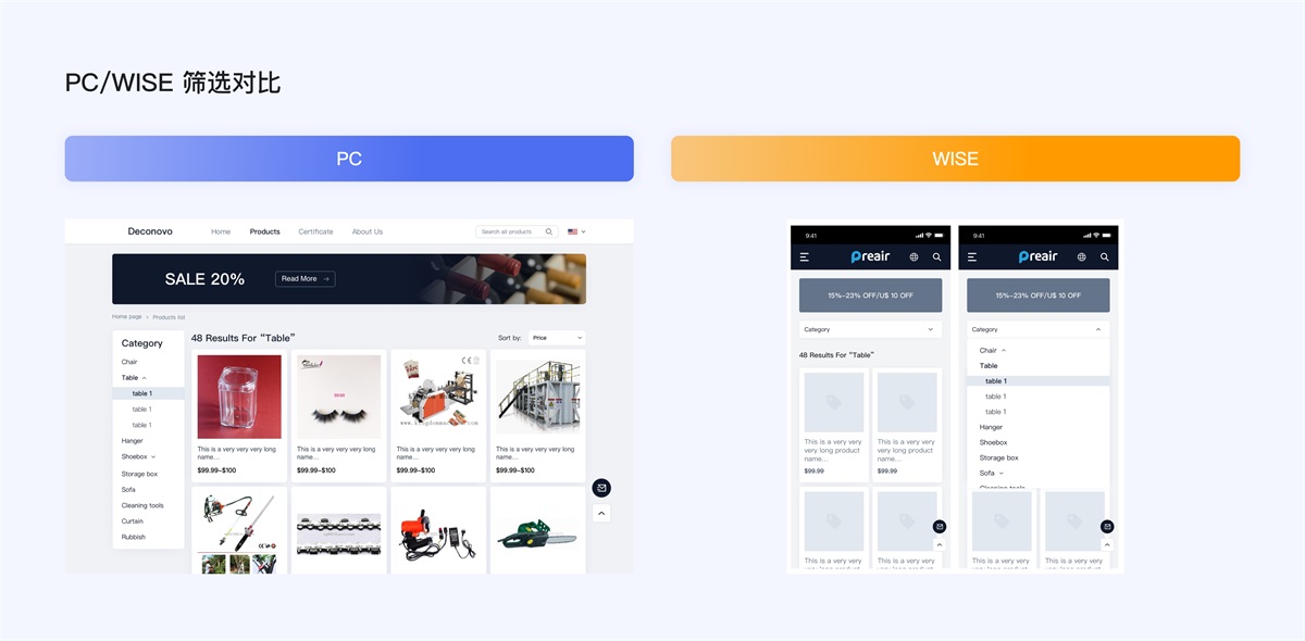 筛选区:PC 端分类筛选区在左侧,默认显示一级分类,点击展示二级分类。在 wise 端,将分类筛选置于商品列表区上方来留出更多展示空间,默认收起然后以模态气泡的形式展开。