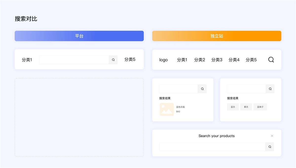 平台对于搜索框的处理较类似,将其置于页面的中心,差异性在于点击搜索框后是否会出现热门搜索和搜索历史来帮助用户进行决策。而独立站都会弱化搜索框,将其置于顶部功能区。原因在于独立站本身品类和 SKU 相对平台较少,搜索的频率需求不明显。点击独立站搜索功能后,有两种设计:品类较少会出现气泡,同时下方显示热门和模糊搜索结果;品类较多出现大气泡,在页面中部强化搜索区。