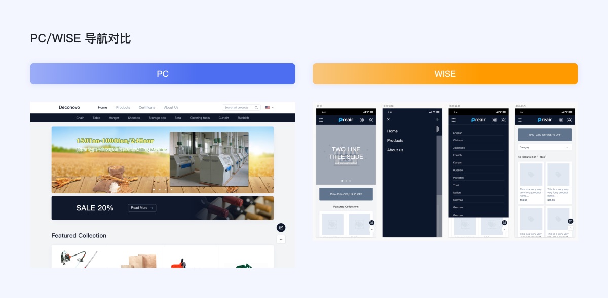 导航区:PC 端的页面导航和功能区处于页面顶部,然后是商品分类。在 wise 端,很难在首页进行复杂的页面切换,因此将其置于左上角的抽屉下,而搜索和切换语言使用了模态的气泡设计,更符合用户手机端下的聚焦单一任务的使用习惯。