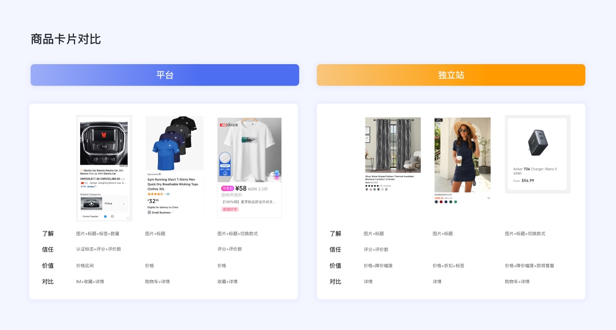 对于商品卡片,平台和独立站都采用了上图下文,适用于图片为主其他信息为辅的卡片,在保持展示卡片个数的同时浏览效率较高。而从细节上来看,平台会有较多信息来强调信任感,因为平台本身商品都由第三方商家提供,所以得给予用户足够信任。而独立站之所以不强调,因为它通过品牌建设来给予用户信任感,所以独立站放大图片面积,缩小信任相关文字信息。独立站另一个特征在于,条目列表页就有较多转化入口,基本可以直接加入购物车详情,来最终缩短用户的决策路径。