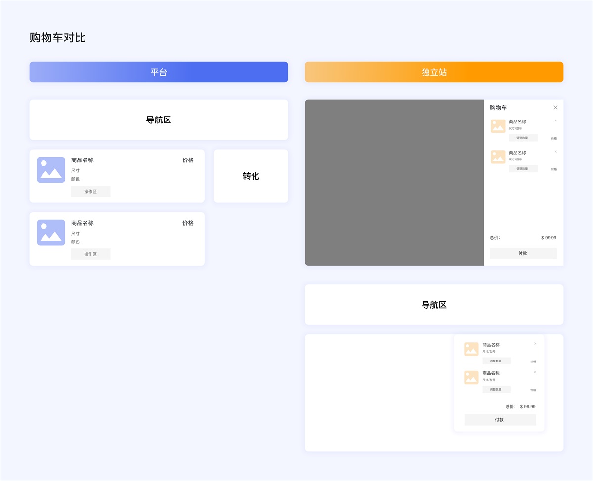 购物车:平台点击购物车会直接跳转到购物车页,购物车页多为左右结构,左边商品列表+右边的总价&付款。相比之下,独立站会有两种设计:商品数目较少,不会设计购物车页,而是通过抽屉形式来进行承载;商品数目较多,hover 到购物车按钮以气泡形式显示已有商品和付款按钮,直接点击购物车按钮也可跳转到购物车页,购物车页本身设计差异不大。