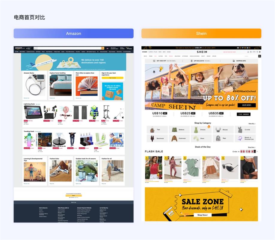 下图分别是国外头部平台亚马逊和独立站 Shein 的首页。亚马逊显得规整,统一,秩序;而右边 Shein 更为丰富,跳跃,自由。我们认为自由,是独立站和平台本质上的差异点。