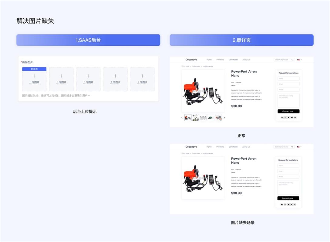 商品图片缺失:首先在 SAAS 后台上传图片的部分设置了图片的必填项,另外设置提示文字来吸引用户上传更多图片。从商详页的排版来看,商品和商品缩略图上下排列,这样在商品图只有一张的情形下,可隐藏缩略图的内容,不会对整体视觉效果产生较大影响。