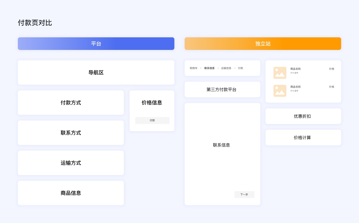 付款页:平台付款页为左右结构,左边是下滑填写付款商品快递等信息,然后右边是付款结算区,悬浮在页面右部分;独立站因为涉及到海外物流和支付,所以为了避免过长信息填写,将左部分设计成了分布填写区,而右边固定是所选商品内容和价格,来降低了用户填写信息时的心理负担。