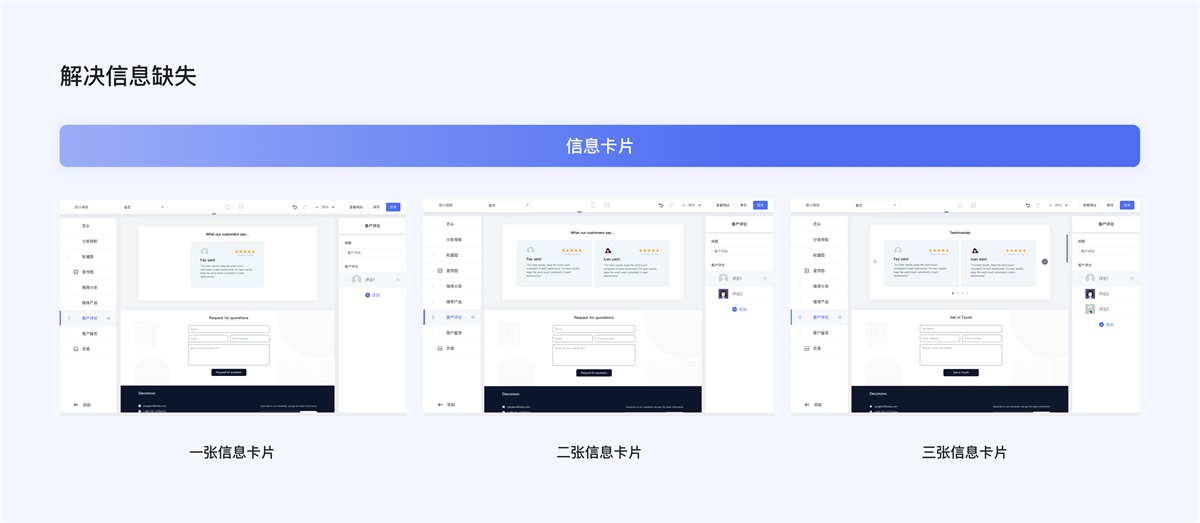 公司信息缺失:在每个信息模块,给予商家调整模块数量的自由度。商家可自由添加信息卡片的数量,一个,二个,三个,或者直接隐藏该模块。针对不同数量的信息模块,也设计对应样式来满足商家需求。