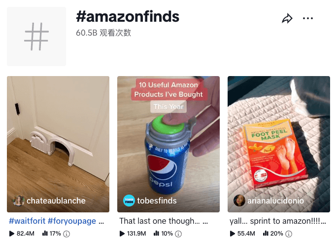 用夸张标题吸引眼球,例如“Top 10 Amazon product…”,附带hashtag蹭大盘热度,比如#amazonfinds,#amazonmusthaves, #amazonprime, #amazonfavorites, #amazonfashion等等。