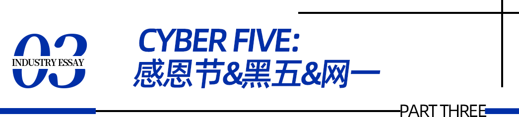 从感恩节到网一为期五天的时间段被称为Cyber Five周,黑五一般在美国感恩节的后一天,标志着美国假期季节的开始,也是Cyber Five 期间的流量最高峰。 感恩节是北美人独创的节日,也是美国最大的节日,类似于中国的中秋节,是一个阖家团圆的机会,同时也是一个消费高峰期。